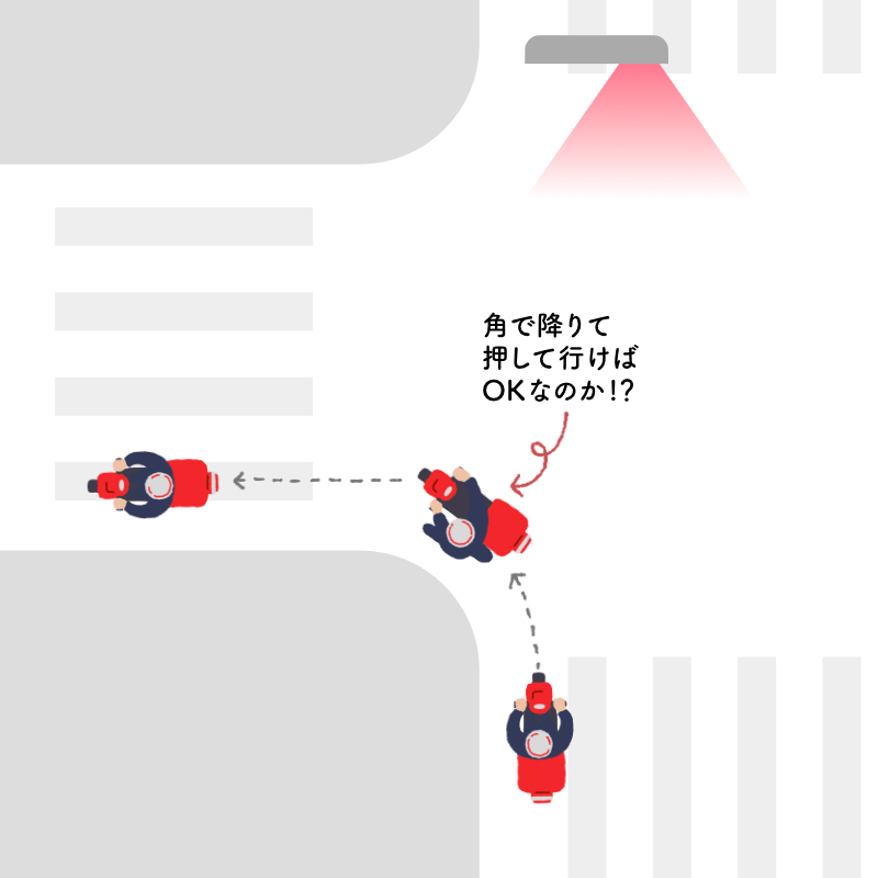 そんな中、↑のイラストにある光景を目にしました。郵便配達のバイクの人がまさに上記のシチュエーションで、なんとバイクを押して歩いて左に曲がって行ったのです!