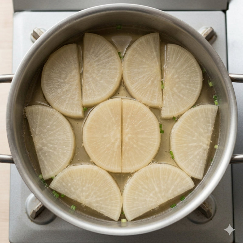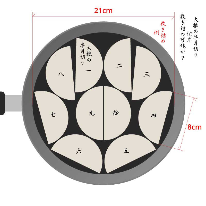 先日、大根を煮た時の話。鍋に水ひたひた、そして半月切りの大根を鍋に1段で重ならないように並べたいのですが、結構ギリギリ収まらないかなという感じでした。